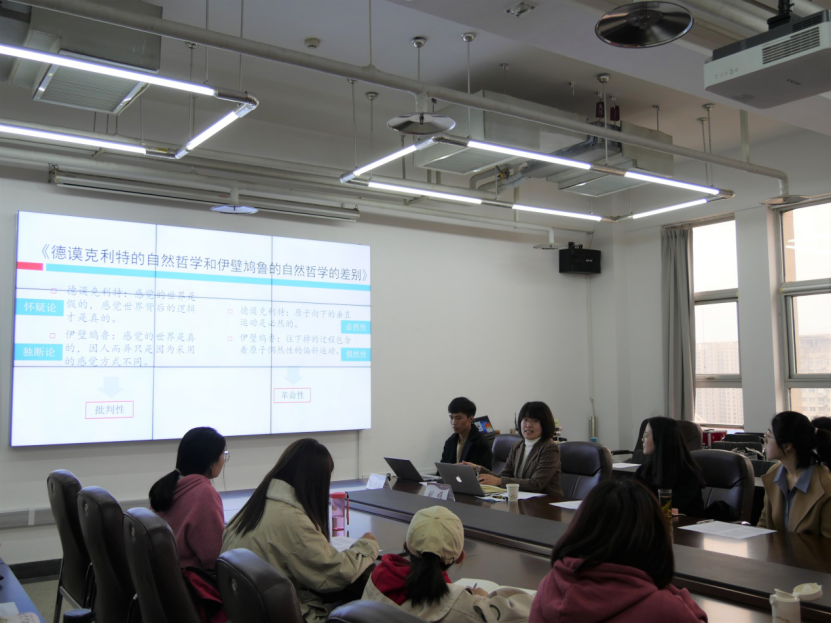 学术共同体。以教师推荐读本、学生自荐领读、师生共同研读的形式,本学期经典读书会共策划开展八期经典阅读活动,书目涉及哲学、文学、历史学、社会学等多个领域。本期读书会围绕马克思的博士论文《德谟克利特的自然哲学和伊壁鸠鲁的自然哲学的差别》进行阅读讨论,共分为“学生领读、教师解读、交流提问”三个环节。