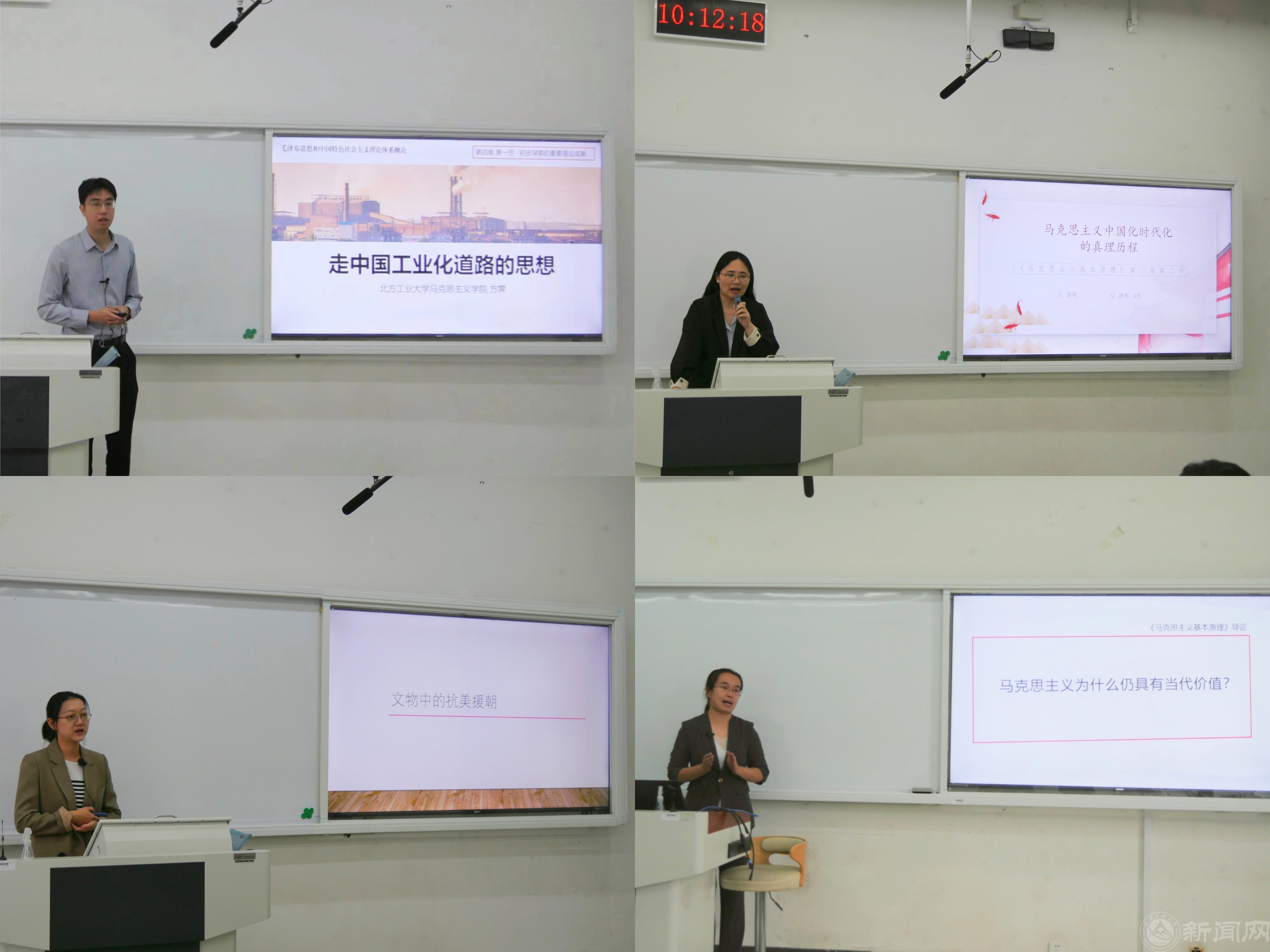 教授袁本文、学校思政课教学督导员王包泉共同担任评委。共有8位青年教师分别围绕“习近平新时代中国特色社会主义思想概论”“思想道德与法治”“中国近现代史纲要”“马克思主义基本原理”“毛泽东思想和中国特色社会主义理论体系概论”等课程内容,结合教学的重难点与学生关切,进行了精彩的教学展示。