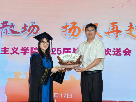 2025届毕业生向学院赠送纪念品,祝福母校桃李满天下。同学们依次饱含深情地回顾了自己在马院度过的求学时光,与老师共同分享毕业蛋糕,感谢母校的悉心培养,导师的谆谆教诲,同窗的深情厚谊。在温馨的氛围中,全体毕业生合唱《光阴的故事》,为活动画上圆满的句号。