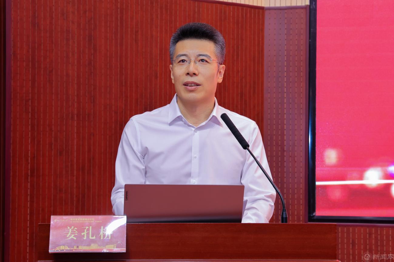 党委副书记姜孔桥致辞。他指出,今年是中国人民抗日战争胜利80周年,本次研讨会以“中共党史党建前沿”与“抗战胜利80周年”为双主线,既是对历史的回顾,更是对新时代党史党建学科使命的践行。他强调,与会学者要以学术研究为纽带,深挖红色资源,讲好党的故事、革命的故事、英雄的故事,为培育时代新人、弘扬伟大抗战精神提供理论支撑。